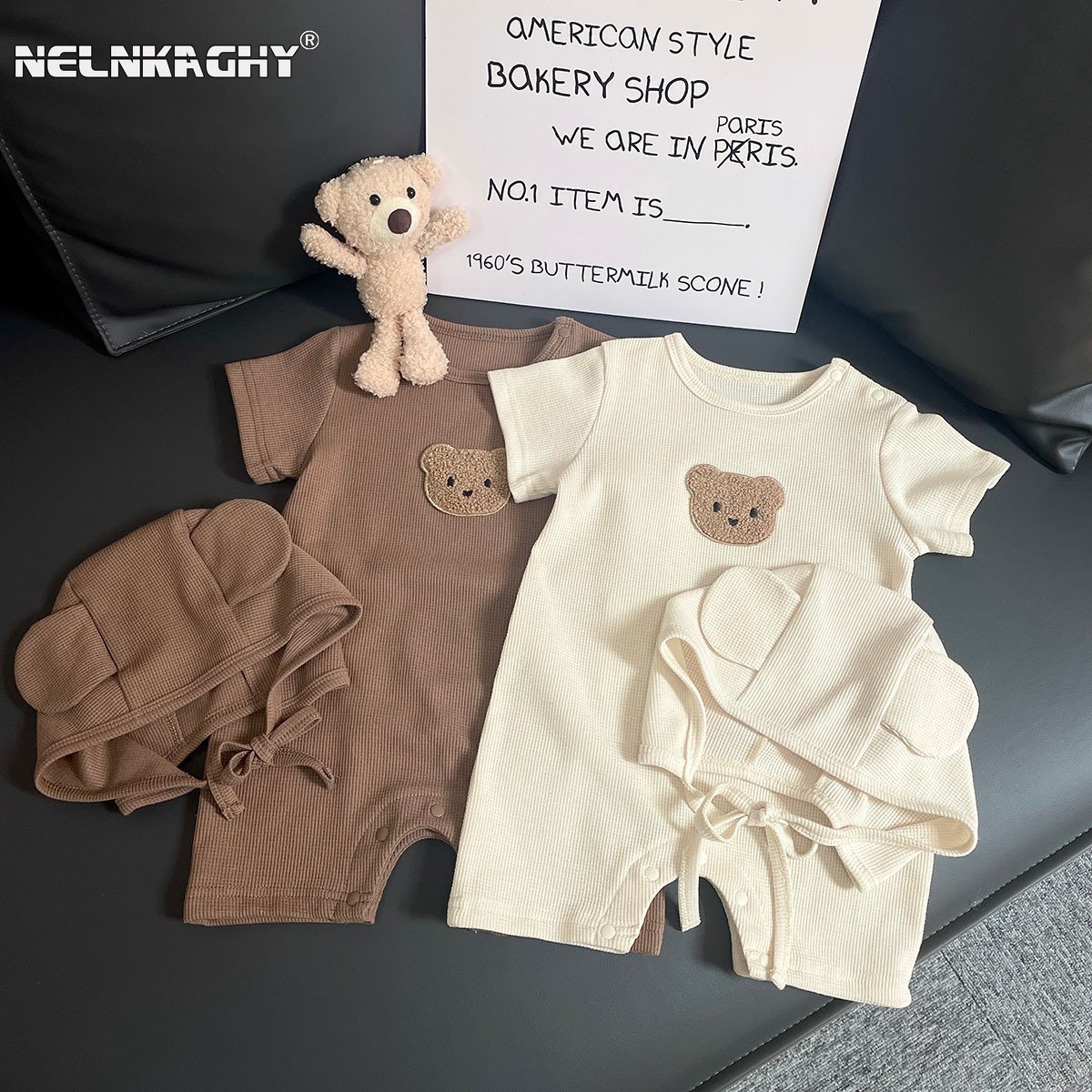 New In Summer Kids Baby Girls Boys Short Sleeve Waffle Patch Bear Infant Newborn Jumpsuits Cotton Romper Gift Hat with Ear
